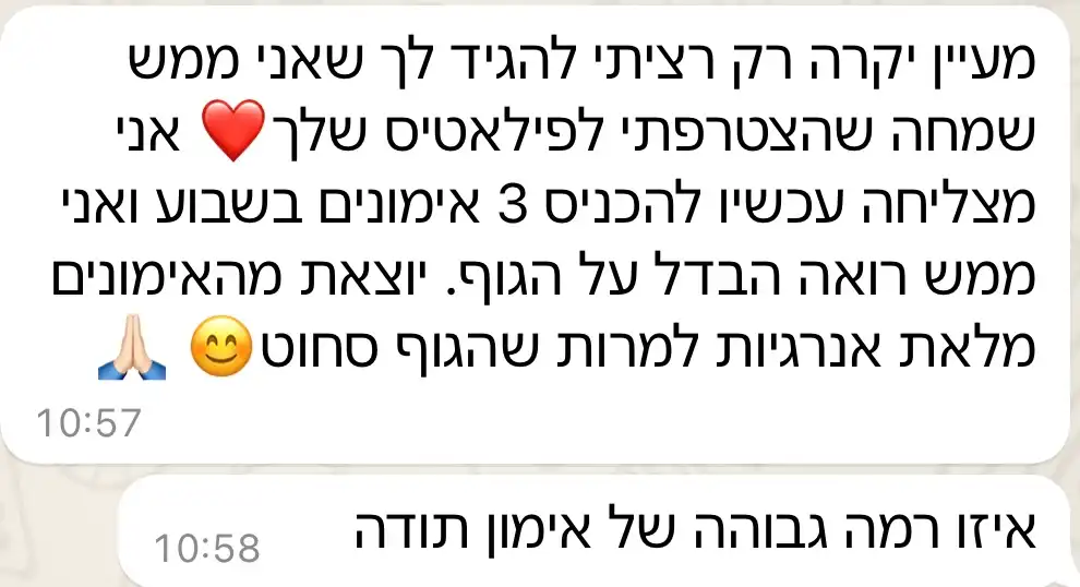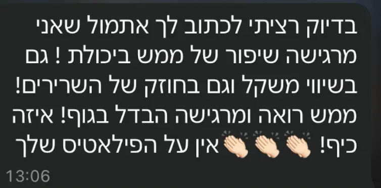 פילאטיס יוצר איזון בין גוף לנפש, ומעניק שליטה עצמית ומודעות גופנית עמוקה שנשמרת כל היום.