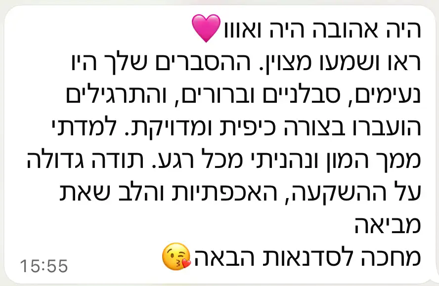 הדגש אצלי הוא יחס אישי ופרטני לכל אחת! כל מי שרוכשת יכולה לפנות אליי באופן אישי לכל שאלה/ התייעצות בכל זמן ותקבל מענה.