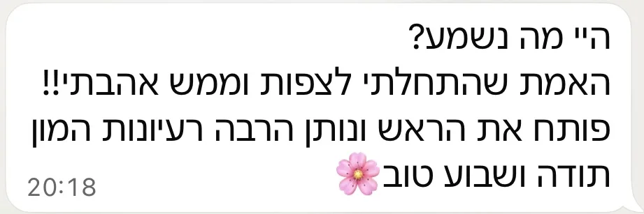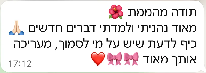 הדגש אצלי הוא יחס אישי ופרטני לכל אחת! כל מי שרוכשת יכולה לפנות אליי באופן אישי לכל שאלה/ התייעצות בכל זמן ותקבל מענה.